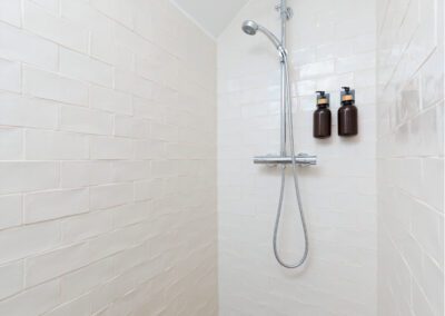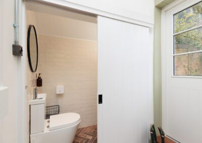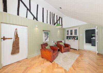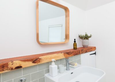 Key features throughout the new transformation reflect this balance of form and function. A downstairs dog shower and wet room add practicality for busy family life, while bespoke panelling in the snug/office cleverly conceals pipework and cables, maintaining the property’s clean, cohesive aesthetic. In the main bathroom, a wooden shelf made from a tree that once stood in the garden adds a personal, sustainable touch. Outside, an old well that was originally planned to be covered, was transformed into a striking feature with glass and lighting, becoming a focal point of the patio.